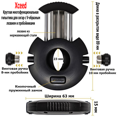 Подходит для практически любых сигар благодаря V-образной гильотине (до 23 мм 58 RG) и двум встроенным пробойникам 8 и 10 мм