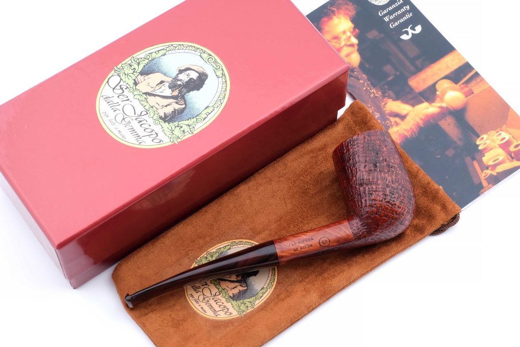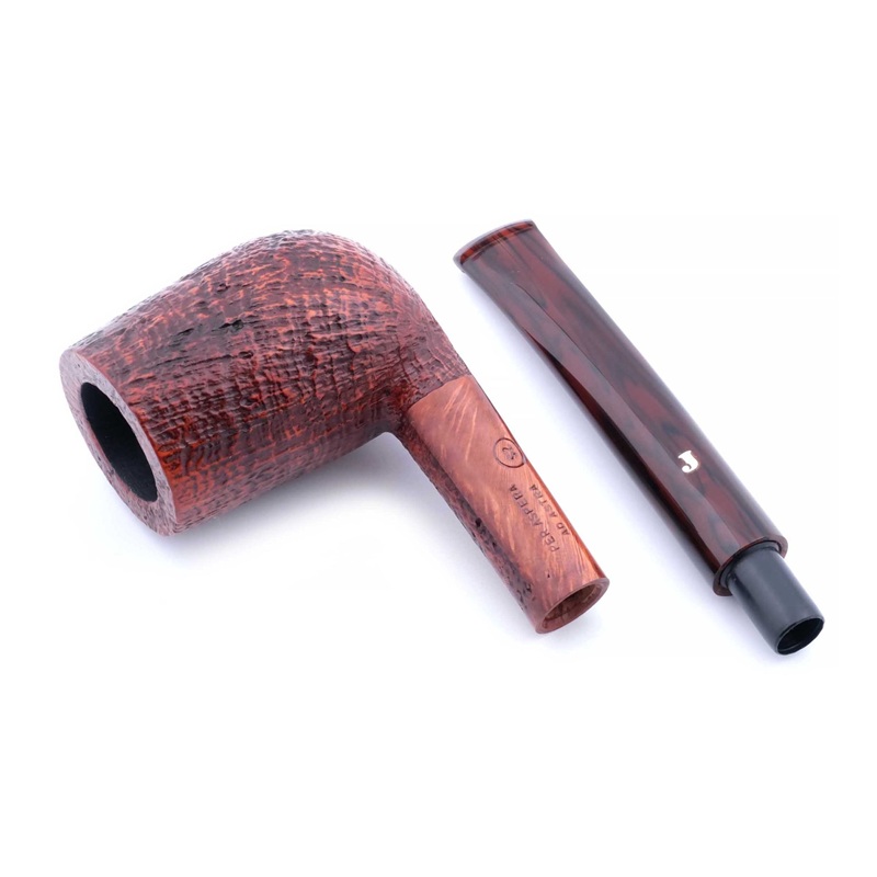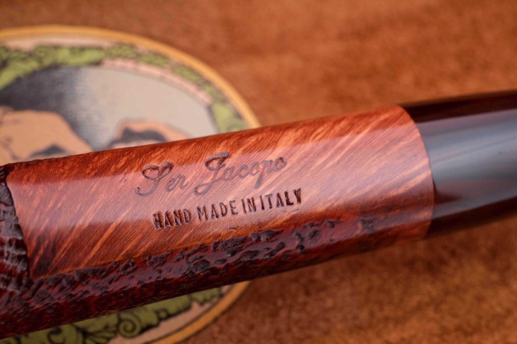 Авторская курительная трубка с отделкой сэндбласт из мастерской Ser Jacopo, выполненная вручную с выразительной текстурой поверхности, подчёркивающей природный рисунок бриара.