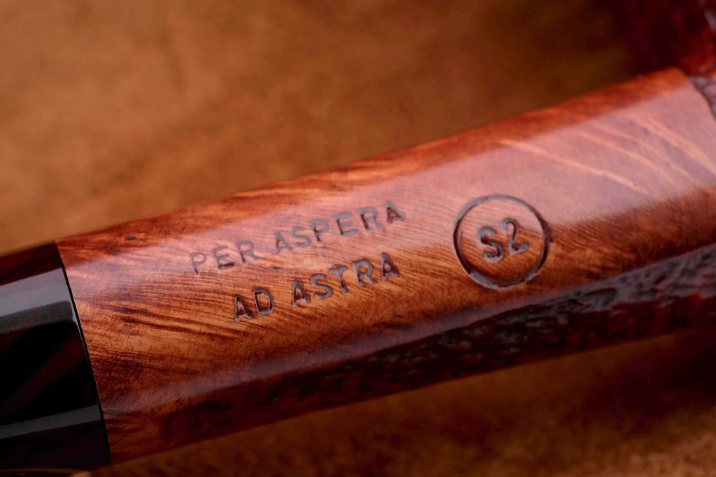 На трубке нанесён фирменный девиз мастерской - PER ASPERA AD ASTRA («Через тернии к звёздам», лат.), а также присутствуют маркировки: Ser Jacopo, Hand Made in Italy и грэйд S2.