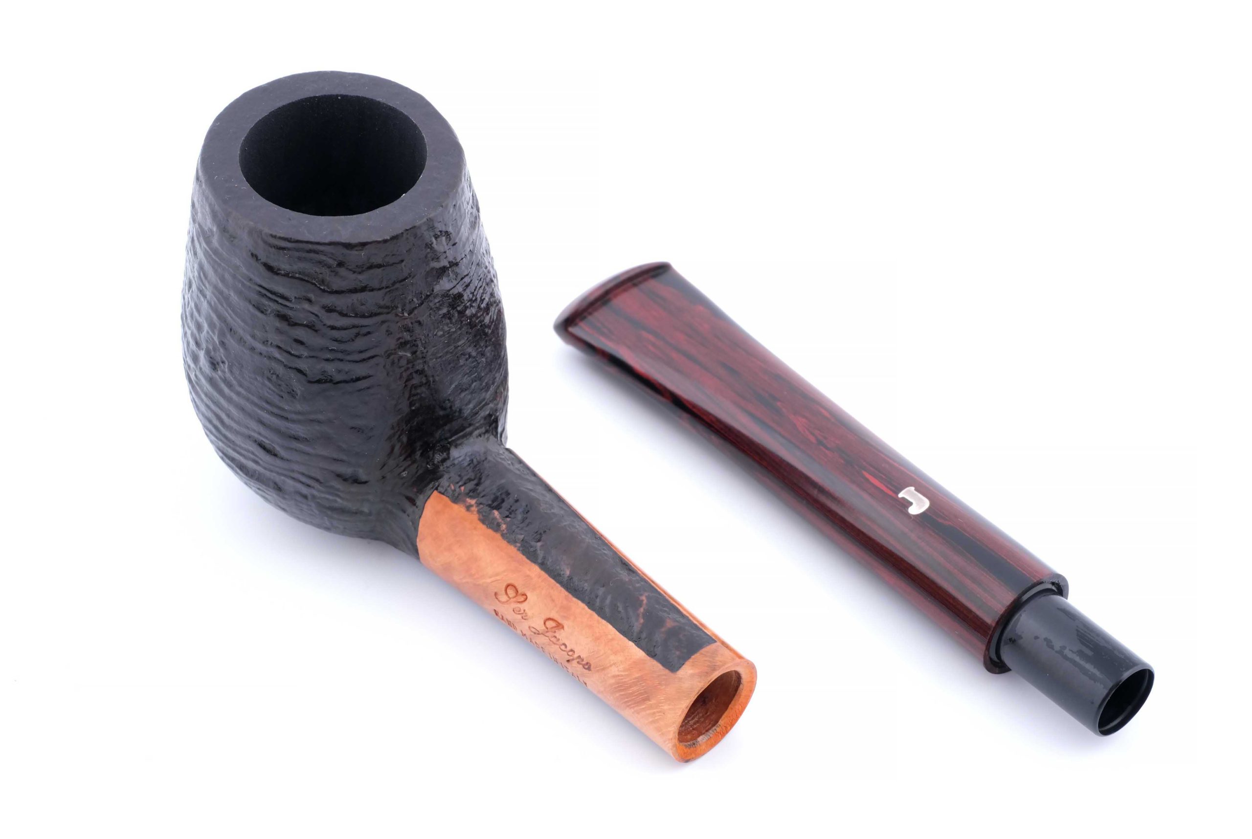Авторская курительная трубка с отделкой сэндбласт из мастерской Ser Jacopo, выполненная вручную с характерной текстурированной поверхностью, подчёркивающей природную структуру бриара.