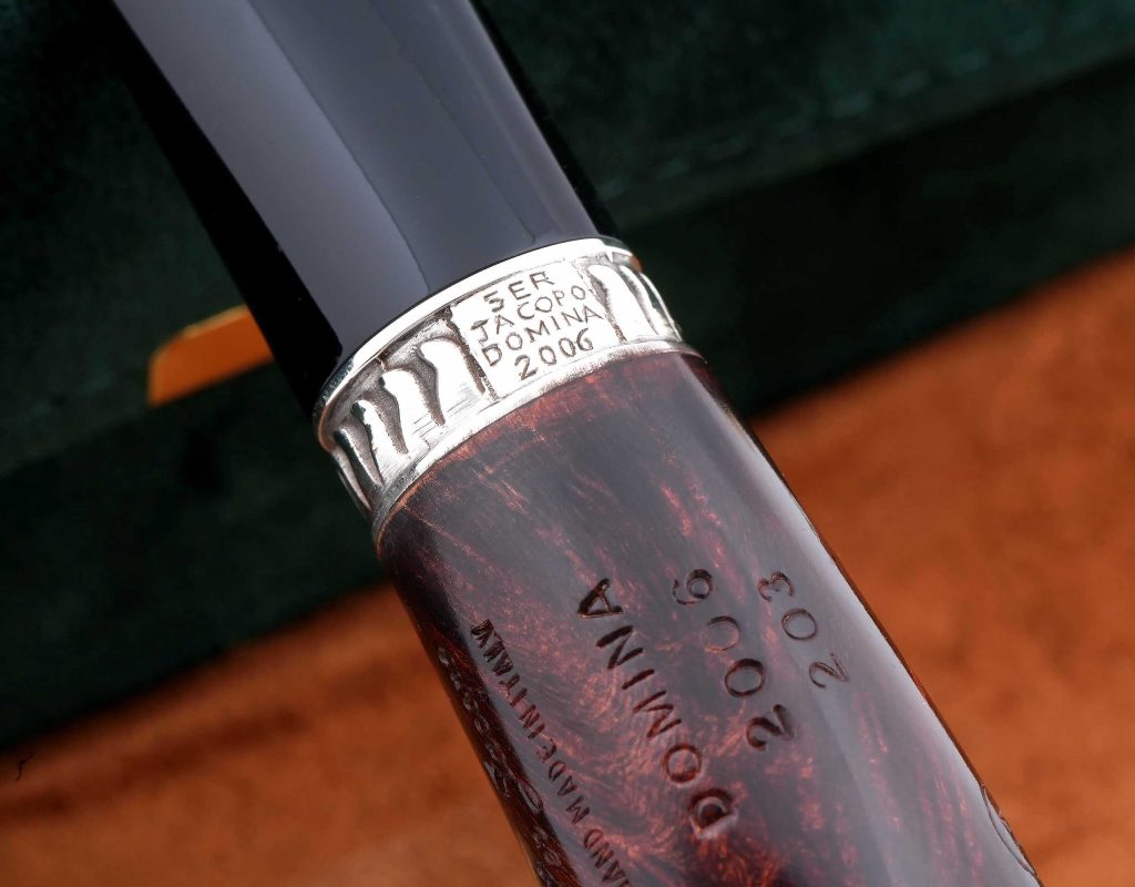На корпусе присутствует фирменный девиз мастерской - PER ASPERA AD ASTRA («Через тернии к звёздам»), а также маркировки: Ser Jacopo, Hand made in Italy, градация отделки L1 D, модель DOMINA 2006 и индивидуальный номер.