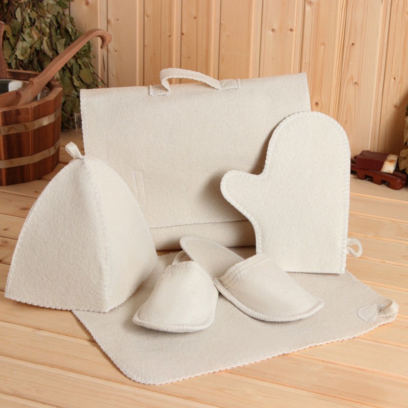 Для комфортного отдыха в парной возьмите с собой набор из пяти предметов. Набор из этого комплекта предохраняют тело от перегрева и являются средствами индивидуального пользования. Влажные изделия рекомендуется сушить в расправленном виде на горизонтальной поверхности. Принадлежности из войлока и фетра стирайте вручную при температуре воды 30 °C.