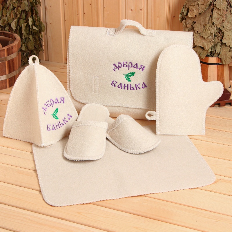 Для комфортного отдыха в парной возьмите с собой набор из пяти предметов. Набор из этого комплекта предохраняют тело от перегрева и являются средствами индивидуального пользования. Влажные изделия рекомендуется сушить в расправленном виде на горизонтальной поверхности. Принадлежности из войлока и фетра стирайте вручную при температуре воды 30 °C.