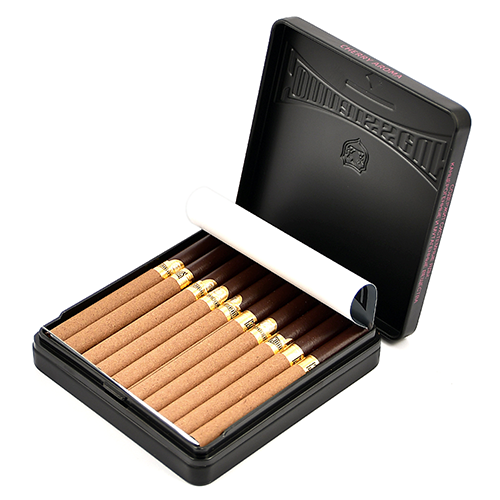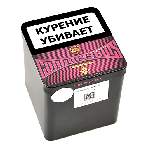 Сигариллы с фильтром "Connaisseurs - Cherry Aroma Tin" c мягким вкусом и натуральным табачным ароматом, в фирменном металлическом портсигаре.Ароматизация: вишня.Длина: 83 мм;Диаметр: 8 мм.В портсигаре: 20 сигарилл, в блоке 5 порсигаров.Производство: ОАЭ.