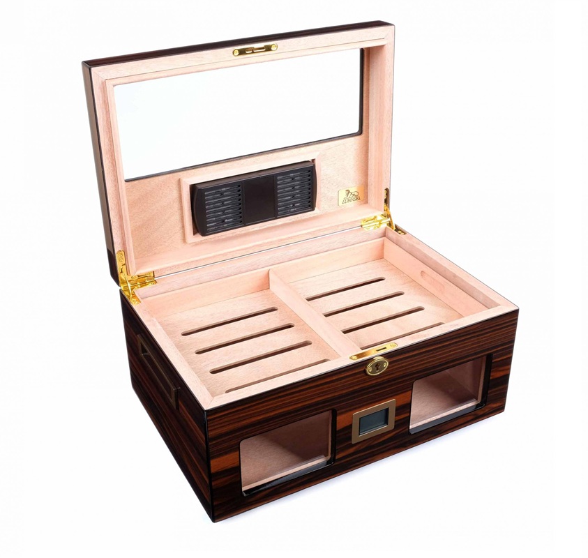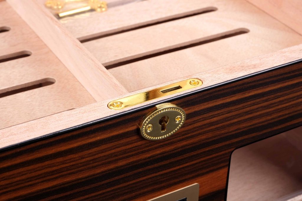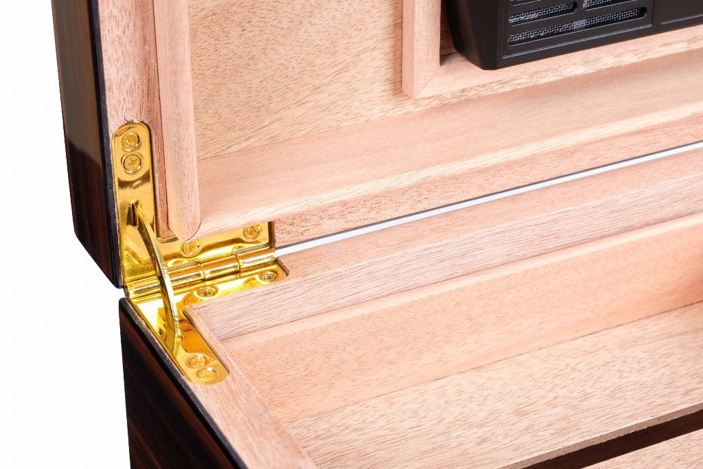 Внутренняя часть отделана испанским кедром, который обеспечивает стабильный микроклимат и способствует правильному хранению сигар. Корпус облицован шпоном индонезийского эбенового дерева (Макассар) и покрыт многослойным глянцевым лаком, придающим изделию выразительный внешний вид и дополнительную защиту.