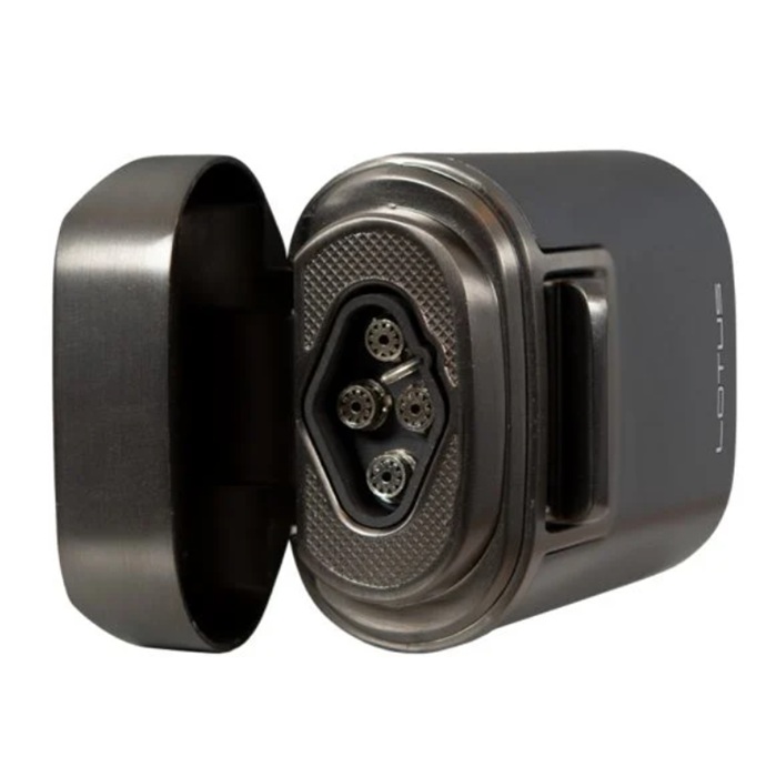 Мощь, стиль и надежность в классическом оттенке Gunmetal. Настольная зажигалка Lotus Brawn Gunmetal T7G - это премиум-аксессуар для настоящих ценителей сигар. Элегантный металлический корпус цвета gunmetal придает устройству строгий и современный вид, а массивная конструкция подчеркивает статус владельца. Четыре мощных турбо-горелки обеспечивают быстрое и равномерное поджигание сигары. Верхняя часть зажигалки служит подставкой для сигары, что делает процесс курения еще более комфортным.